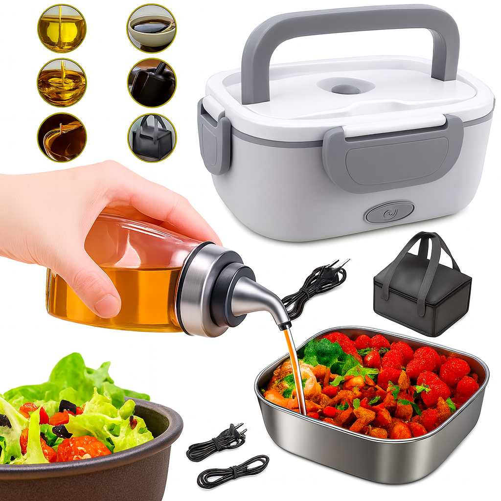 Combo de dispensador de aceite y lonchera térmica eléctrica 2 en 1 con recipiente de acero inoxidable.